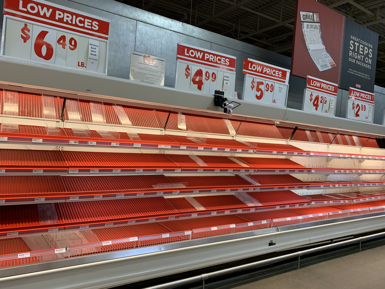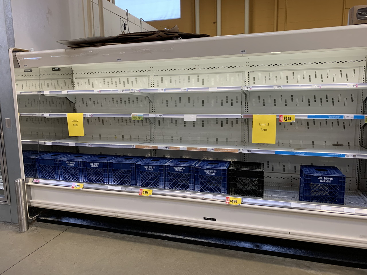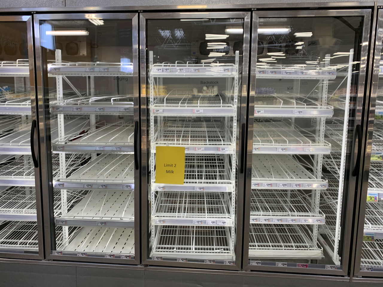 閉店時間間際のシェルフの状態。生鮮、肉類、ベーカリー、乳製品、卵などが空なのが目立っていた。
